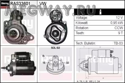 Стартер 12V 0,8 Kw VW Caddy I 1,6 1_83-7_92 ,Jetta II 1,6 3_86-10_91 ,SEAT Toledo I 1,6 5_91-3_99