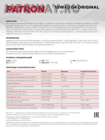 Масло моторное полусинтетическое 10W-40 PATRON ORIGINAL A3/B4 SN/CF 1л